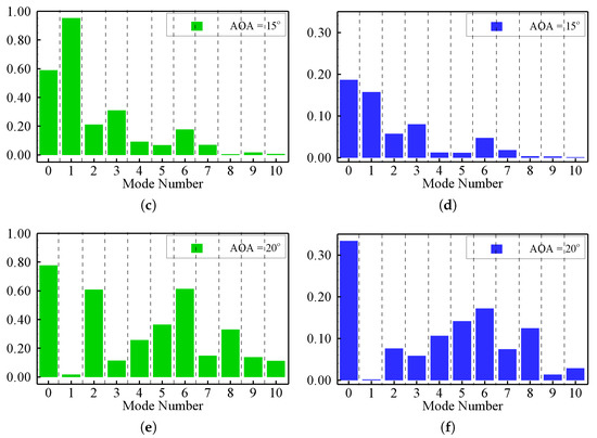 The LDC and DDC of mean and the first ten modes of each simulated case are plotted in Figure 13. It can be seen that contribution of the mean mode is significant to the lift and drag, and its significance in terms of magnitude increased with AOA. Figure 13a,b show that mean plus first modes are enough to model the lift and drag coefficients of AOA = 10° using model (24b). In the case of AOA = 15°, the mean plus the first four modes are sufficient for lift and drag models, while, in the case of AOA = 20°, as we can infer from Figure 13c,d, the LDC and DDC of first eight modes are significant, which would contribute to lift and drag models.