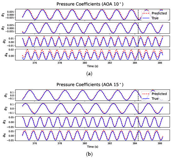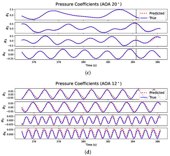 (a) the first four pressure coefficient at AOA 10° (vertical black line indicates the train test split). (b) The first four pressure coefficients at AOA 15°. (c) The first four pressure coefficients at AOA 20°. (d) The first four pressure coefficients at AOA 12°.