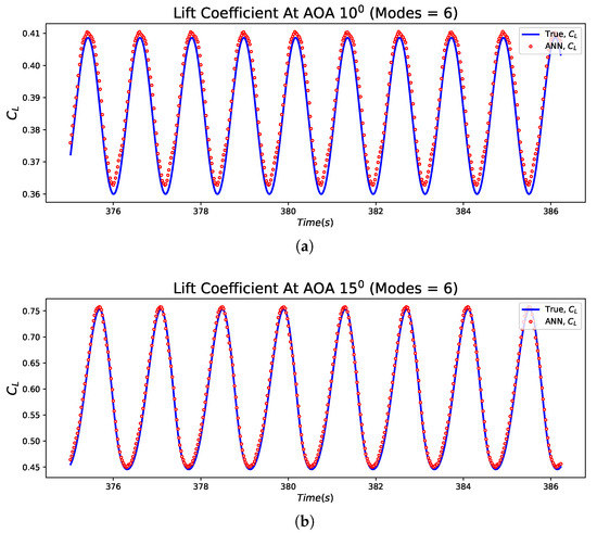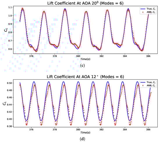 (a) Lift coefficient prediction at AOA 10° using six modes. (b) Lift coefficient prediction at AOA 15° using six modes. (c) Lift coefficient prediction at AOA 20° using six modes. (d) Lift coefficient prediction at AOA 12° (out of sample data) using six modes.