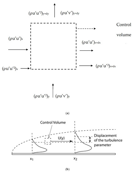 Since this formalism is relatively new, a synopsis of the logic involved is presented herein. For a control volume moving at the local mean velocity, U and V, the effects of turbulence fluctuation components (the Reynolds stress) can in effect be isolated, as depicted in Figure 2. Equation (1) is the transport equation for u’ [14,15,16], where the streamwise flux u’u’ is balanced by the lateral transport, u’v’, pressure and viscous forces. Figure 2a shows similar momentum (v’) and energy transport (u’2), leading to Equations (2) and (3), respectively, while Figure 2b illustrates the displacement transform discussed below.