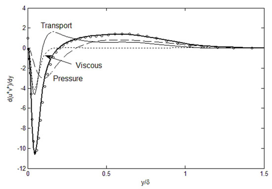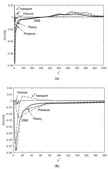 In these equations, the fluctuating terms, u’v’, v’2, etc., are implicitly Reynolds-averaged. The concepts and hypotheses contained in Equations (1)–(3) are described in Lee [17], and also summarized in the next section due to its novelty. These turbulence transport equations, upon validation, furnish a sufficient number of equations to solve for the turbulence variables, when used in conjunction with the Reynolds-averaged Navier–Stokes (RANS) equation(s). Examination of the terms in the Lagrangian turbulence equations illuminates the subtle but intuitive dynamics for the momentum and energy transport. Equation (1), as an example, depicts the Reynolds shear stress as the net lateral transport of the turbulence momentum to balance out the streamwise flux, pressure and viscous forces. The agreement with the DNS data [8] for u’v’ gradient, when computed with Equation (1), is quite good as exemplified in Figure 1, and confirms the simple Lagrangian momentum balance. This is in contrast to the Eulerian models requiring several layers of adjusted relationships to the mean variables. In the Lagrangian perspective, momentum conservation holds in any non-inertial coordinate frame (the Galilean invariance) and the principle of relative motion removes most of the complex coupling with the mean components, leaving bare the core dynamics of turbulence fluctuating variables. In place of unproven proportionality to the mean velocities, relating one fluctuating component to another makes far more dynamical sense.