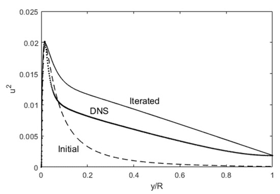 Figure 9 and Figure 10 show the result of running the above routine. The starting test functions for u’2 and v’2 are lognormal functions, while we expedite the numerics with an initial U = y1/n, where n = 7. All the test functions, including this U, are updated using Equations (1)–(3) during the iteration. To facilitate convergence, we also use a y m type of function on the “backside” (y/R = 0.5~1) for u’2, which ensures that the boundary conditions are enforced both at y/R = 0 and 1. After just one iteration, a reasonable u’2 profile starts to emerge, after again setting u’2 = (u’2)y/R = 1 at y/R = 1 (the centerline boundary condition), in Figure 9. (u’2) y/R = 1 can be obtained from DNS data, or estimated from E (Equation (8) below).
