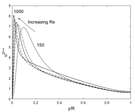 In Figure 11, we see that E is all but constant, when properly normalized by the friction velocity (u’+ = u’/Uτ where Uτ is the friction velocity). For the dissipation, ε, there is a linear dependence on the Reτ. Therefore, for a fixed normalized energy content, E, dissipation increases because the relative influence of viscosity is reduced at higher Reynolds numbers. If we invoke the Second Law (the entropy principle), the u’+2 distribution distorts itself to achieve the maximum dissipation until the restraining force of viscosity imposes its upper limit, all the while obeying the physical constraints of continuity, smoothness, E = constant, and boundary conditions at the wall and the centerline (see Figure 12). The maximum distortion, which may be interpreted as turbulence entropy, is set by ε as a function of Reτ. Therefore, the origin of the uniqueness and structure of the solutions to RANS can be said to be due to the Second Law. After this manifestation, other turbulence variables organize themselves according to the momentum (Equations (1), (2) and (6)) and energy (Equation (3)) conservation principles.