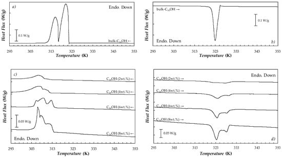 (a,c,e,g) Cooling and (b,d,f,h) heating DSC thermograms measured at β = 2 K·min−1 for (a,b) bulk C16OH alkanol and (c,d) PCM emulsions.