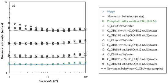 The shear rate, , and dependence of the dynamic viscosity, μ, were investigated for water; the phosphate buffer solution (0.04 M); bulk cetyl alcohol (only in the liquid phase) and the three nanoemulsions sets (C16OH/W, C16OH + C20OH/W and C16OH + SiO2/W) at of 1–100 s−1 and temperatures between 283.15 and 333.15 K. Figure 5a shows the flow curves obtained for water, PBS and some representative PCMEs at 283.15 K (when dispersed particles are solid). The μ results measured for water exhibited maximum deviations lower than 4% with the previous literature [80]. Slight differences (lower than 3%, within experimental uncertainty) were observed between the viscosities of the water and the phosphate buffer solution used as a continuous phase. A viscosity value of 8.19 mPa·s was measured for cetyl alcohol at 333.15 K, which agreed with data of 7.91 mPa·s reported by Fu et al. [81]. Like the phosphate buffer solution and bulk cetyl alcohol, nanoemulsions containing 2–6 wt.% loadings of the dispersed phase are mainly Newtonian within the investigated shear rate. However, a slight decrease in shear viscosity with a rising shear rate (so-called pseudoplastic or shear thinning behavior) was observed for the 8 wt.% emulsions (particularly in the case of the emulsion containing silica nanoparticles).