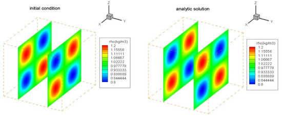 In the simulation, the ideal gas equation of state is used with a gas constant . A rectangular domain of , and is discretized using a Cartesian-structured mesh. The simulation is run up to a final time of 1.0 s. The initial condition and analytic solution of the density at 1.0 s is plotted on x–z slices at and which are shown in Figure 1. The cases to be simulated are listed in Table 2. The refinement factors of the mesh size, , and time step size, , are both equal to 2.