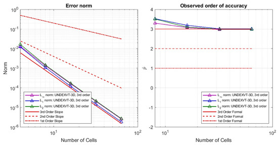 As an example, the error norms and the observed order of accuracy tested on the 3D third-order solver are plotted in Figure 3. The numeric values are listed in Table 3.