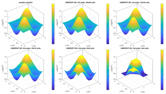 The order of accuracy verifications on 2D and 1D solvers are performed in a similar way. The simulation results using the 2D third-order solver performed on different grid levels are plotted in Figure 4. Their observed order of accuracy is plotted in Figure 5. The numeric values are listed in Table 4. Code verification on the second- and first-order solvers will be included in the author’s dissertation.