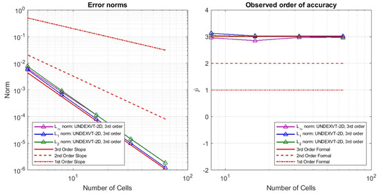 The , and norms are all used to calculate the error norms between the simulations and analytic solutions. The method of calculation of the error norms is shown in Equations (19)–(21). The observed order of accuracy is calculated using Equation (22).