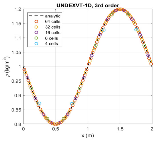 Figure 5 and Table 4 indicate that the observed order of accuracy for the 2D third-order solver matches the formal order of accuracy. The 2D third-order solver succeeded in the code verification. The simulation results using the 1D third-order solver performed on different grid levels are plotted in Figure 6. The observed order of accuracy is plotted in Figure 7. The numeric values are listed in Table 5.