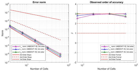 Observed order of accuracy of the 1D third-order solver (left: error norm; right: observed order of accuracy).