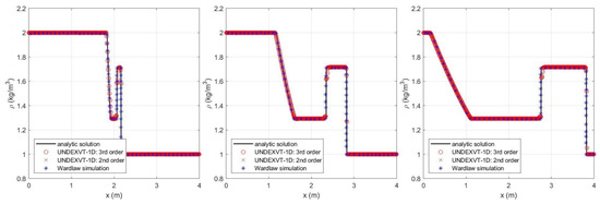 A Cartesian-structured mesh of 400 cells of uniform size is used to discretize the domain. The simulation is run up to . Wardlaw performed a simulation of the same case, using numerical techniques of unknown types [41]. Solutions at , and the final time are presented, along with analytic solutions and Wardlaw’s simulation solutions. The ideal gas equation of state is used to model the thermodynamic behavior of both fluids. The gas constant is equal to 1.4. The densities at these three times are plotted in Figure 9, the velocities are plotted in Figure 10, and the pressures are plotted in Figure 11.