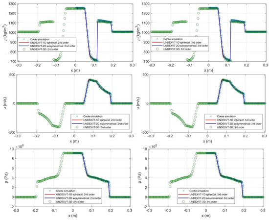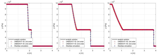 Case 1: In this case, a one-dimensional shock tube problem that consists of fluids of the same material is simulated using UNDEXVT-1D third- and second-order solvers. The configuration of this case is described as follows, and is illustrated in Figure 8. A domain of m is equally separated by fluids of states L and R in the initial condition. The density and pressure of fluid L are equal to and , respectively. The density and pressure of fluid R are equal to and , respectively. The velocities of both states equal zero in the initial condition.