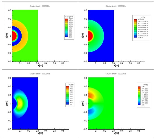 Efforts to model near-field UNDEX using CFD were made as early as the 1980s. One-dimensional modeling and simulation were performed first. Flores used a 1D spherical fluid-governing equation as the mathematical model, and solved it using Glimm’s method [17]. Cocchi applied a Godunov-type prediction–correction method in the algorithm so that property values at the gas–water interface were effectively corrected [18]. The application of this method was able to use analytical solutions of 1D Riemann problems when the equations of the state of both the explosive gas and the surrounding water were modeled as ideal [19]. The analytical solution of the one-dimensional shock tube problem provided a better understanding of the physics of the shock wave, the rarefaction wave and the movement of the material interface between the two phases.