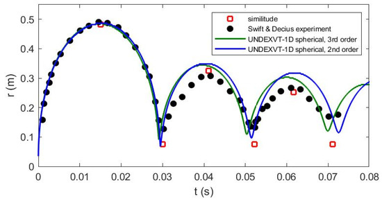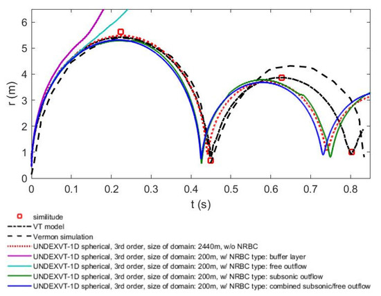 Case 6: Next, an explosive charge of 227 kg TNT at 45 m below the surface is investigated. References [51,52] provide the numerical results for comparison with this case. This case is used to further explore the performance of non-reflecting boundary conditions and their application to the simulation of bubble dynamics where the simulation time is relatively long and there are multiple bubble periods in the time history. A simulation using a large domain is first performed without an NRBC, such that the shock wave does not reach the boundary within the simulation time. Simulations using domains of limited size are then performed, such that an NRBC is needed. The accuracy for the four types of NRBC is compared in Figure 28.
