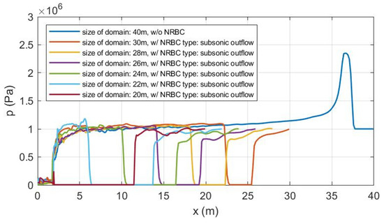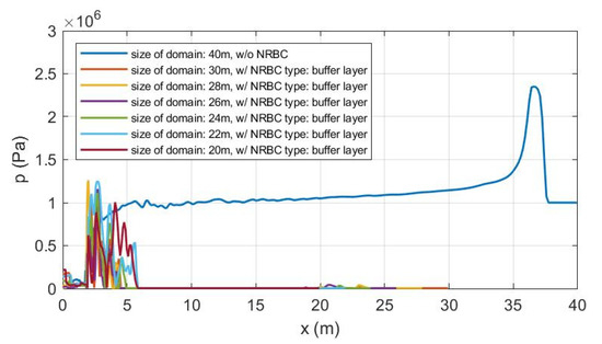Figure 26 shows that this NRBC absorbs the shock wave without reflecting chaotic noise, and the accuracy of this type of NRBC is not affected by the domain size; however, it reflects a cavitation zone back into the fluid, which substantially distorts the flow solution.