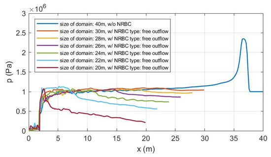 Figure 24 indicates that the free outflow type of NRBC outperforms the buffer layer in that it successfully absorbs the shock wave and does not reflect it, but the size of the domain affects the solution accuracy with any significant domain size reduction, meaning that it is of limited value.