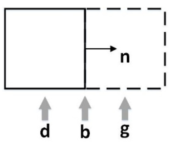 The third type of NRBC is the subsonic outflow condition. The mathematical derivation of this subsonic outflow condition involves a compressible CFD characteristic analysis. The implementation of this type of NRBC is also more complicated than in the previous two types. A cell stencil at the boundary is illustrated in Figure 25. In this diagram, d denotes a boundary cell, b denotes a boundary, and g denotes a ghost cell. The details of its implementation are described in Equation (26).
