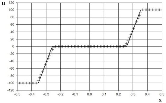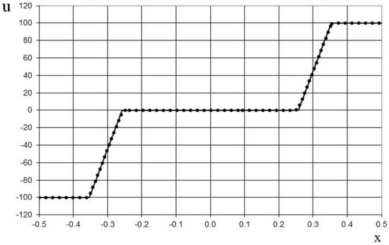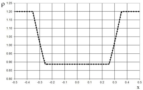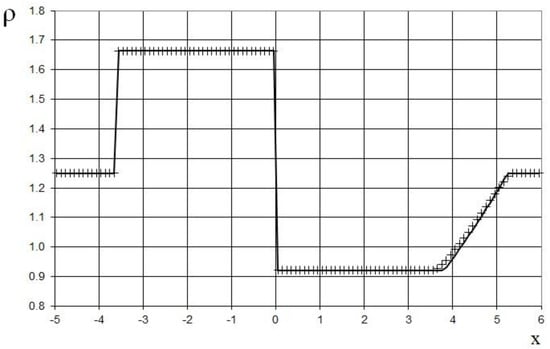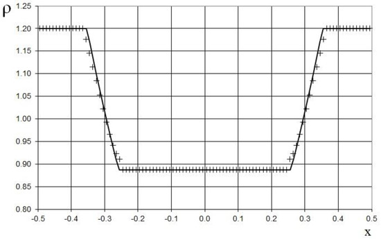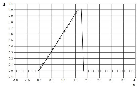 The modeling area was taken to be . The grid contained 50 cells, and the grid step was . The time step was chosen according to the Courant criterion (15), where is the convective velocity of the shock in (42), where , i.e., the shock propagates to the four grid cells. The time step was . It should be noted that the rarefaction wave (at its right boundary) has the convective velocity in (43), and propagates to the eight grid cells. At the time , the rarefaction wave catches up with the shock, but is not able to overtake it (44).