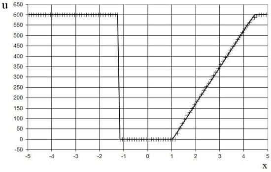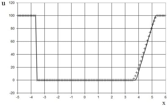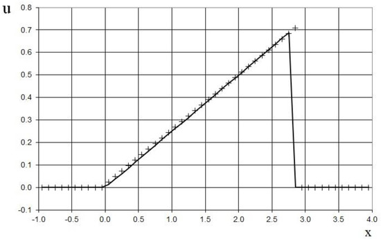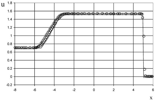 The modeling area was taken to be . The grid contained 80 cells, and the grid step was . The time step was chosen according to the Courant criterion (15), where is the convective velocity of the shock in (45), where , i.e., the shock propagates to the two grid cells. The time step was .