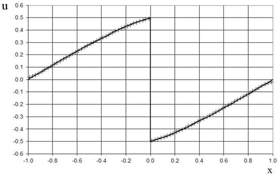 Velocity plot for the shock–rarefaction wave problem for the inviscid Burgers’ equation at the time : the exact solution (line), and the present method (cross).