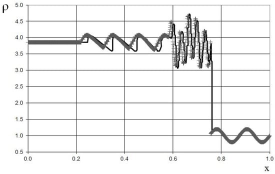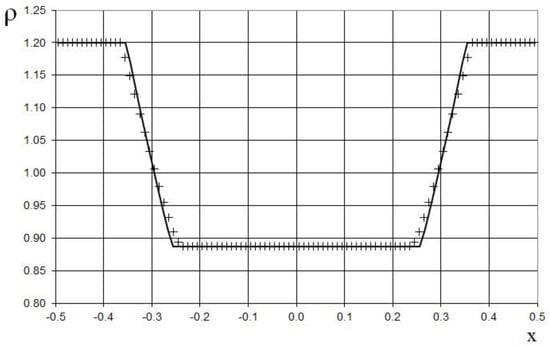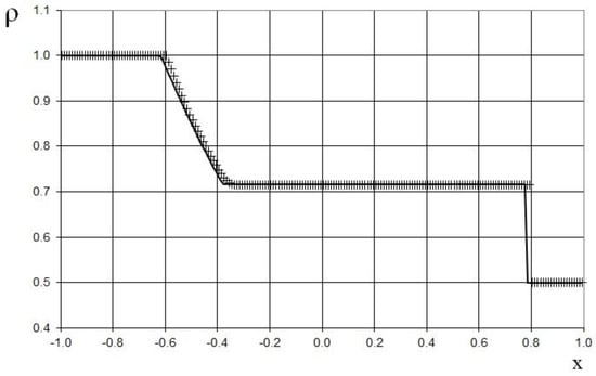 Density plot for the shock-tube problem (46) for the adiabatic gas dynamics equations: the exact solution (line), and the present method (cross).