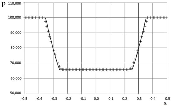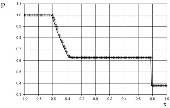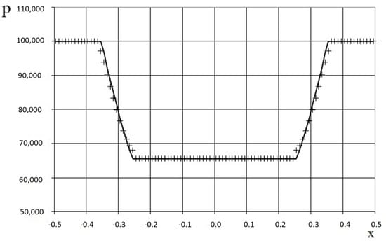 Pressure plot for the shock-tube problem (46) for the adiabatic gas dynamics equations: the exact solution (line), and the present method (cross).