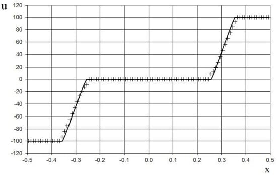 Velocity plot for the problem (45) for the inviscid Burgers’ equation (): the exact solution [40] (line), and the present method (cross).