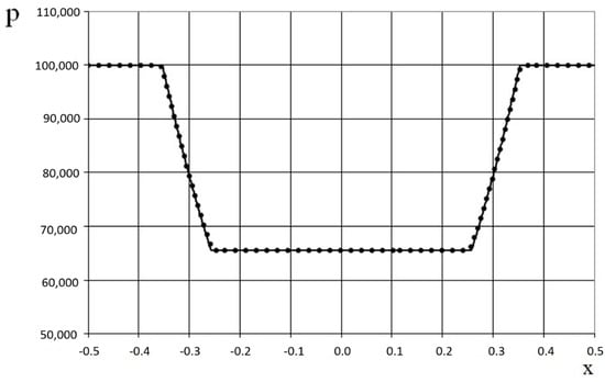 The modeling area was taken to be . The grid contained 100 cells, and the grid step was . The time step at the acoustics stage was chosen according to the Courant criterion (25), where , i.e., the shock propagates through seven grid cells at the acoustics stage. The time step at the convection stage was chosen according to a similar criterion (26), where , i.e., the shock propagates to two grid cells at the convection stage. The marching time step was chosen as .