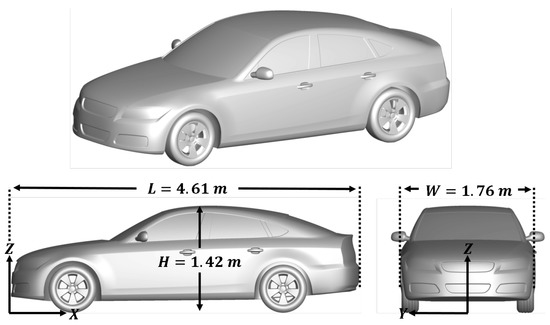 For the current work, we used the full-scale DrivAer fastback model with a free-stream velocity of 16 m/s. The Reynolds number (based on vehicle length and free-stream velocity) was , and such a Reynolds number matched those from the experiments by Heft et al. [31] and Collin et al. [32], who used a scaled model with a free-stream velocity of 40 m/s. The vehicle model and free-air conditions matched those for the 1st Automotive CFD Prediction Workshop [33]. At the domain inlet (Figure 2), the free-stream velocity was applied with a turbulence intensity of .