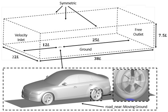 The inlet was placed upstream of the vehicle nose, with an outlet positioned downstream of the vehicle base. The vehicle surface was set to a no-slip condition. The surrounding domain walls were set to a symmetry condition to replicate the free-stream, with the exception of the ground plane. For the rotating wheels case, a moving ground condition was applied beneath the vehicle along the ground plane (Figure 2), and the ground plane was set to the free-stream velocity (16 m/s) to replicate the moving belt commonly used in experiments. To simulate the wheel rotation, a sliding mesh condition was used, and a rotational rate of rpm was set in accordance with the free-stream velocity and tire radius. The bottom of the tires intersected the ground plane, creating a morphed geometry. Such morphed geometries resembled the contact patch of a physical vehicle, and such a tire treatment was reported to have good predictive capabilities for flows around the wheels [34,35]. A closeup of the morphed geometry is highlighted in the inset of Figure 2. For the stationary wheels case, a no-slip condition was used both along the ground plane and at the wheels.