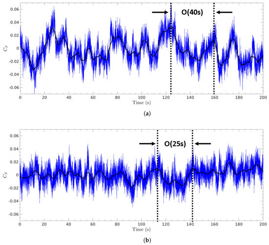 where is the instantaneous side force that varies as a function of time t, and (or ) is positive along the positive Y-axis (right side of the vehicle). Large-scale oscillations on the order of 10 s or greater dominate the side force signal for both the stationary and rotating wheels cases. Such long-period oscillations become more apparent in the filtered signals (with a sliding average window of 5 s, corresponding to the peak nausea-inducing frequency of 0.2 Hz or ). Considering that the typical bluff-body vortex shedding periods for the given flow are s (based on a Strouhal number of ), the time periods of these large-scale oscillations are at least one order of magnitude longer than the vortex shedding periods. Such a long-period phenomenon, which is also aperiodic in nature, aligns well with the observations from the side force measurements for the simplified square-back automotive models [2,8], and these previous studies referred to this phenomenon as the bi-stability of the wake. Wheel rotation is found to significantly decrease both the magnitude and periods of these bi-stability oscillations, as evidenced by the peak-to-peak distances highlighted in Figure 6.
