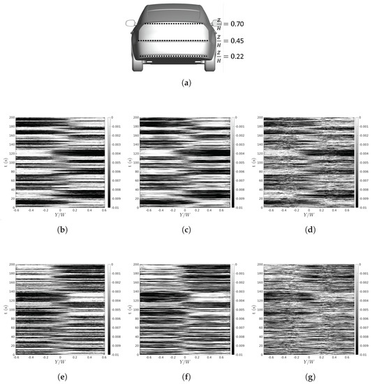 Fluctuations in the surface pressure coefficient extracted from (a) slices on the vehicle base at (b) (stationary wheels), (c) (stationary wheels), (d) (stationary wheels), (e) (rotating wheels), (f) (rotating wheels), and (g) (rotating wheels).
