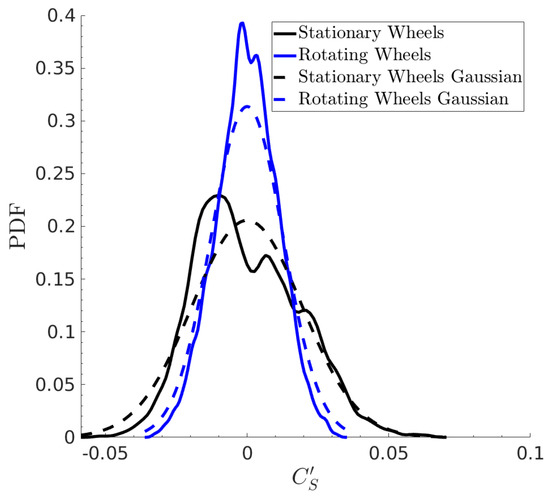 Although still clearly present in both cases, the bi-stability shows large changes in the side-force PDF when changing the state of the wheels. By using rotating wheels, the PDF becomes thinner, aligning well with the reduction in large-scale fluctuations, as observed in Figure 6. In addition, the two peaks in the PDF of the rotating wheels case have moved closer to each other, resulting in a more symmetric, Gaussian-like profile. Such a trend suggests that the bi-stability becomes less pronounced, albeit still observable, for the rotating wheels case. Additionally, these results also suggest a difference in the bi-stability of the DrivAer model from that of the simplified Windsor model, wherein the implementation of wheels almost fully eliminated a second peak in the PDF of the side force for both stationary and rotating wheel conditions [2].