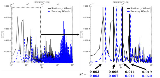 In order to identify the influence of wheel rotation on the relevant frequencies of the bi-stability, Figure 10 plots the Pre-multiplied Power Spectral Density (PPSD) of the side-force coefficient fluctuations. The PPSD was computed using Welch’s method with a Hamming window, for both stationary and rotating wheels cases. Two window segments were used with an overlap to preserve the low-frequency content. Further increasing the window segments did not change the frequency content for either the stationary or rotating wheels cases.