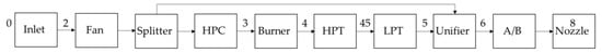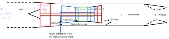 The fan (LPC) pressurizes incoming air. The air flow is then split up; one part, the core flow, is directed to the HPC and the remaining air flow is bypassed. The core flow is further compressed in the HPC and then led to the burner for combustion. After combustion, the core flow is expanded, first in the HPT and then in the LPT. Power is extracted from the HPT and LPT. In this study, the HPT provides shaft power both to the HPC and to a generator for electric power generation. The LPT provides shaft power to the fan. Turbofan engines, designed for fighter aircraft, use mixed exhausts []. The core flow and bypass flow are mixed in the unifier before entering the afterburner. The afterburner offers an opportunity to increase engine thrust at flight cases where high engine thrust is required; the use of afterburner is referred to as “augmented power” or “augmented” in the text. The mixed flow is finally accelerated in the nozzle. An engine process model diagram is shown in Figure 3.