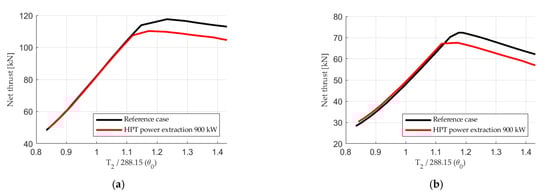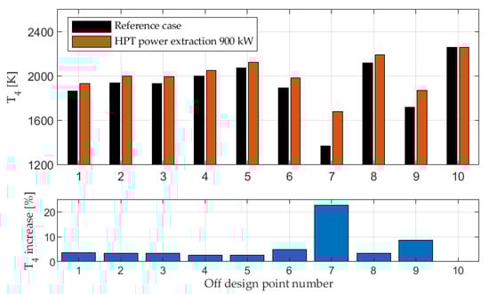 The engine is running at a higher T4 to meet the higher power output required from the HPT as shown in Figure 5. The need for temperature increases to meet the thrust requirements provided in Table 2 is consistent with statements and findings in [,,,]. In point 10, where the engine is limited by its maximum T4, HPT power extraction has an adverse effect on engine net thrust, causing the net thrust decrease shown in Figure 4.