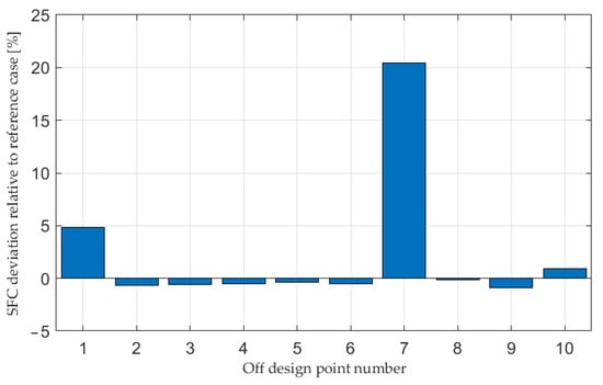 The engine controller limits OPR to the OPR specified for each design point and turbine inlet temperature to 2260 K. SFC is plotted versus design point OPR in the mission point in Figure 13 and Figure 14. Mission point 1 is shown in Figure 13 and mission point 2 is shown in Figure 14. The SFC variation with varying design OPR is in line with expectations, both at non-augmented [,] and augmented power []. The SFC values provided in Figure 13 and Figure 14 are calculated as mean values of several points with a common design OPR.