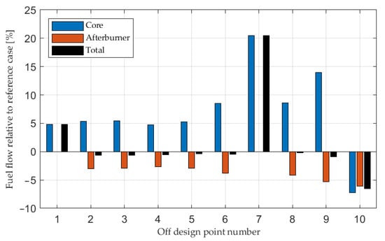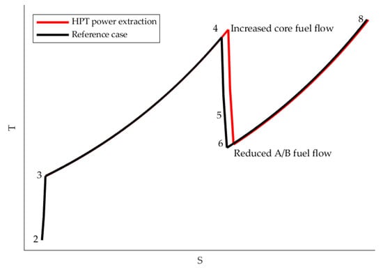 Figure 6 illustrates the relative deviation of SFC for the power extraction case compared to the reference case. The SFC increase at the non-augmented mission points 1 and 7 is in line with previous investigations performed for high bypass ratio turbofan engines and power extraction [,,,], but it should be noted that SFC is improved for point 2–6 and 8–9 with power extraction compared to the reference case. These are all cases where the engine operates near or at its OPR upper limit. At these cases, the increased core fuel flow is compensated by an afterburner (A/B) fuel flow reduction, shown in Figure 7. From a thermal efficiency perspective, it is always better to add heat at a higher pressure []. A schematic T-S diagram, given in Figure 8, is used to explain this further. The numbers in Figure 8 correspond to the station numbers shown in Figure 1. At lower engine power settings, the power extracted from the HPT accounts for a larger share of the total power generated by the engine, and this increases SFC significantly, as shown by point 7 in Figure 6. This complies with earlier investigations performed with power extraction from high bypass ratio turbofan engines [].