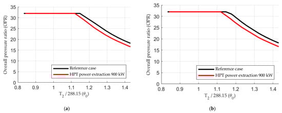 Some reflections can be made about the design parameters specified above. With a turbine inlet temperature in the range 1900–2000 K, an OPR in the range of 32–35 is suggested in []. If the maximum OPR limit is raised to a higher value, the engine performance at high altitudes/low Mach numbers can be improved, but this will require a higher aerodynamic overspeed margin compared to the design point []. An increased aerodynamic overspeed margin will increase both maximum corrected mass flow and maximum pressure ratio relative to the design point. If the corrected mass flow and pressure ratio of the design point is unaltered, a compressor map expansion is required, which in turn requires an increased engine inlet area. However, this inlet area increase will increase the aircraft fuselage cross-sectional area, causing increased aircraft weight [] and aircraft drag []. One might want to sacrifice low speed/high altitude performance of the engine by limiting the maximum allowed corrected mass flow and pressure ratio. This will allow for a smaller cross-sectional area of the inlet. Hence, at low speeds/high altitudes and maximum power, the engine controller will limit OPR to its maximum value []. At these occasions, the turbine inlet temperature (T4) will not reach its maximum value and the specific thrust of the engine will not be as high as if it could operate at the maximum temperature [].