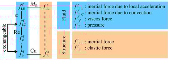 where μf is the fluid viscosity, C is the wing’s compliance, and mw is the wing’s mass. The parameter (21) is the ratio of the inertial force due to the local acceleration to that due to the convective acceleration. As shown in Figure 3, these four nondimensional parameters determine all ratios among all force terms appear in each FSI system. Hence, each FSI system can be specified using these four nondimensional parameters, and the dynamic similarity between two different FSI systems can be measured as their distance in the nondimensional parameter space.