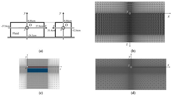 Geometry of the fluid domain and the employed mesh: (a) The geometry of the fluid domain (dynamically scaled); (b) The xz—plane view; (c) The yz—plane view, where the colored domain shows the wing’s mesh; (d) The xy—plane view. The number of fluid elements is 1,578,960 and the number of fluid nodes is 276,138.