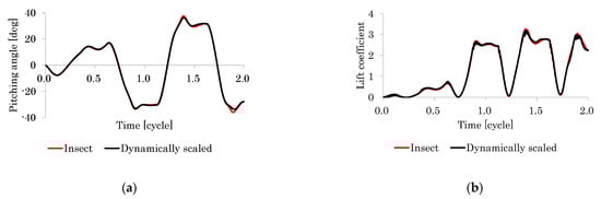 The purpose of this test is to demonstrate that the present dynamic similarity framework can make two different FSI systems dynamically similar to each other. For this purpose, the pitching angular displacement and the nondimensional lift are used, since the former is the representative characteristic quantity of the structure in the passive pitching motion, and the latter is the representative characteristic quantity of the surrounding fluid. Here, the lift force is defined as the total fluid force acting on the wing in the direction perpendicular to the stroke plane.