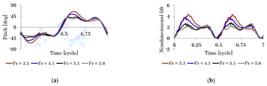 Figure 9a,b show the time histories of the pitching angular displacement and the nondimensional lift, respectively. In the middle of each half stroke in insect flapping wings, the dynamic pressure and the elastic force are dominant or the fluid and structural inertial forces are significantly damped [30]. Here, Ca values are same among different Fr. Hence, in Figure 9a, the pitch angles in the middle of each half stroke are almost equivalent among different Fr. On the contrary, the first peak of the pitch angle in each half stroke increases following the decrease of Fr. This can be explained as follows: