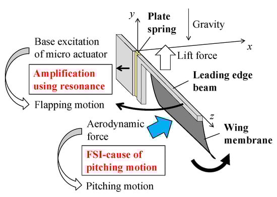 In the FSI design [35], a flight device for FWNAVs, which consists of the micro wings, the actuator, and the transmission [6], actively uses the FSI to create the characteristic wing’s motions. It can reduce the mechanical and electrical complexities of this device [36]. Hence, it is essential for further miniaturization of FWNAVs. Computational approaches are necessary for this biomimetic concept because of the complexity of the FSI. However, there are few studies focusing on this topic.