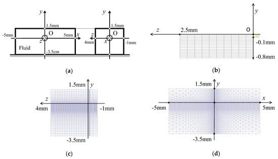 Geometry of the fluid domain and the employed meshes: (a) The geometry of the fluid domain; (b) The yz-plane view of the wing’s mesh, where the domain colored by yellow is the plate spring; (c) The yz-plane view of the fluid domain; (d) The xy-plane view of the fluid domain.