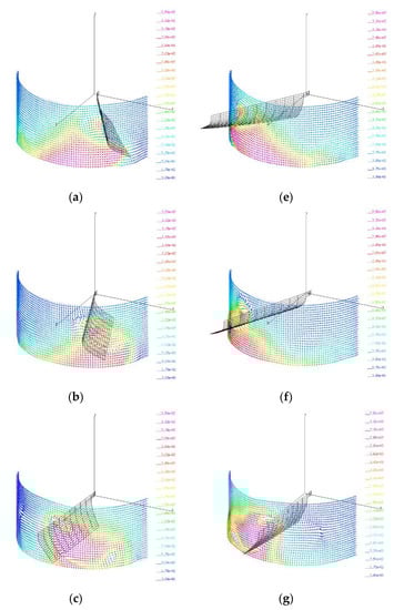 Wing’s flapping motion and the surrounding flow during the upstroke, where the wing flaps from right to left in the left column, and the wing flaps from left to right in the right column: (a) The time instant of 8.48 cycle; (b) The time instant of 8.60 cycle; (c) The time instant of 8.72 cycle; (d) The time instant of 8.84 cycle; (e) The time instant of 8.96 cycle; (f) The time instant of 9.08 cycle; (g) The time instant of 9.20 cycle; (h) The time instant of 9.32 cycle.