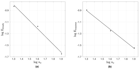 where the summation is over the number of nodal points along the midplane. For the transient case, we have calculated the error as the average of the above-mentioned error measure over the first 5 seconds. From Figure 2, the rate of convergence of the error is found to be approximately equal to 1.360 and 1.084 for the steady and transient cases, respectively.