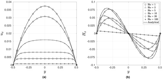 Comparison of the numerical and analytical solutions along the mid plane for Hartman–Poiseuille flow: (a) (b) .