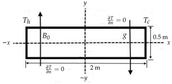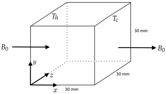 This problem is based on experiments performed by Okada et al. [37]. Gallium as a working substance is kept in a cubical cavity. A temperature difference is applied across the fluid, and a magnetic field is applied in a direction parallel to the temperature difference as shown in Figure 10.